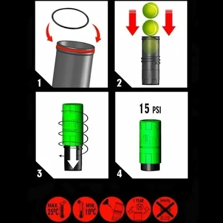 Il pressurizzatore Tuboplus è un dispositivo progettato per prolungare la durata delle vostre palline mantenendole sotto pressione. Questo vi permetterà di godere di palline fresche e reattive più a lungo.